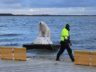 Promenaadi hooldava firma Rannaroos OÜ mehed vinnasid karu parvele ja vedasid ta köitega kaldale.