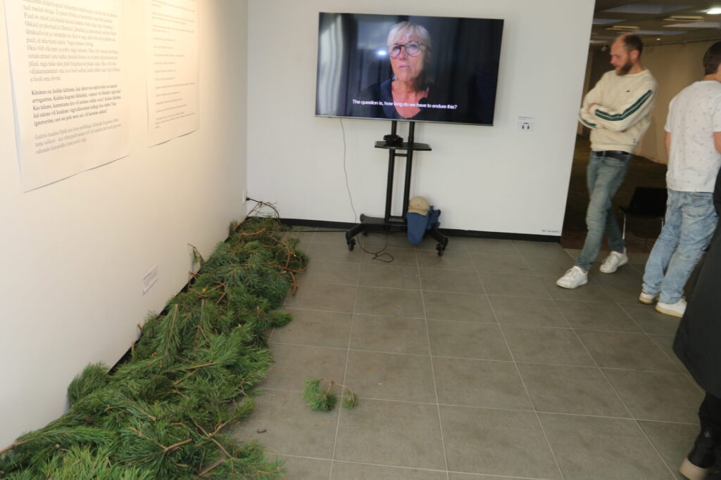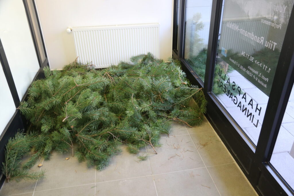 “See on suunatud igasuguse vägivalla ja kannatuste vastu,” ütles kunstnik keset galeriid toolil istudes ja männiokstelt okkaid kitkudes.