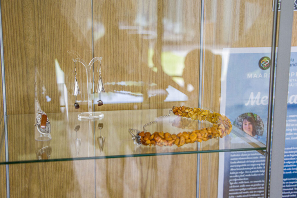 Kutsehariduskeskuse lõputööde kõrval Haapsalu kultuurimaja fuajees on oma ehteloomingu välja pannud kooli kutseõpetaja Maarja Koppelmaa.