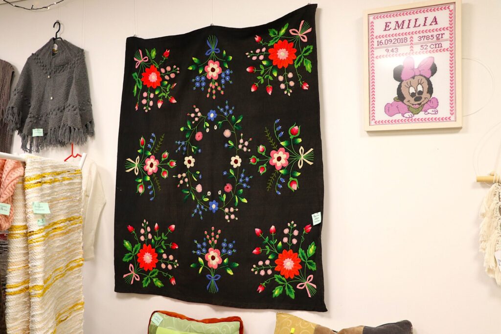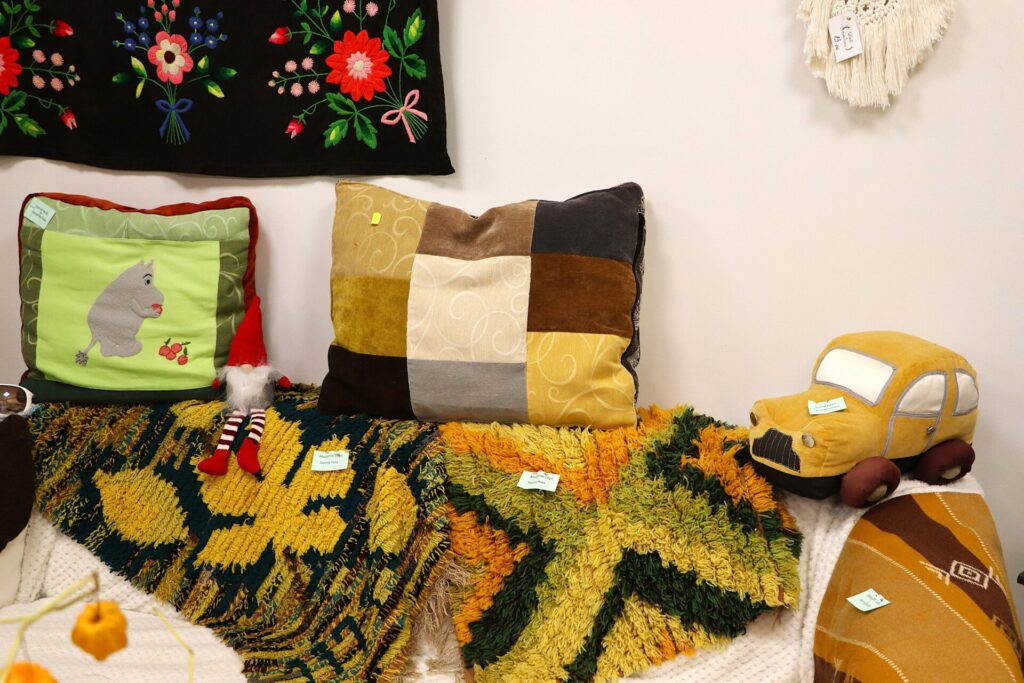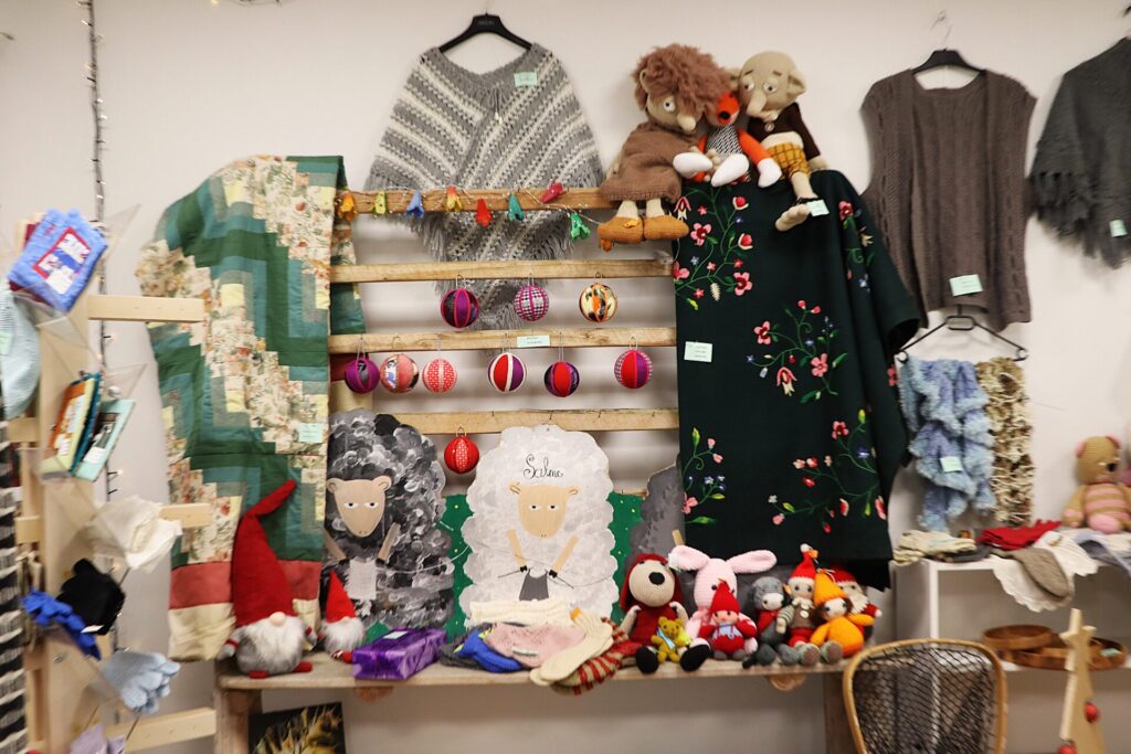 Kaltsuvaibad, mütsid, heegeldatud mänguasjad, lapitekid, kõikvõimalikud kudumid, heegeldatud pitskindad, makramee, tikitud pildid ja linikud, betoonist lillepotid, puidust lauad-toolid ja palju-palju muud on Oru raamatukoguhoidja Kaja Puusepp näitusele sättinud; tema hoiab näitusel ka silma peal.