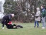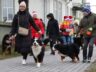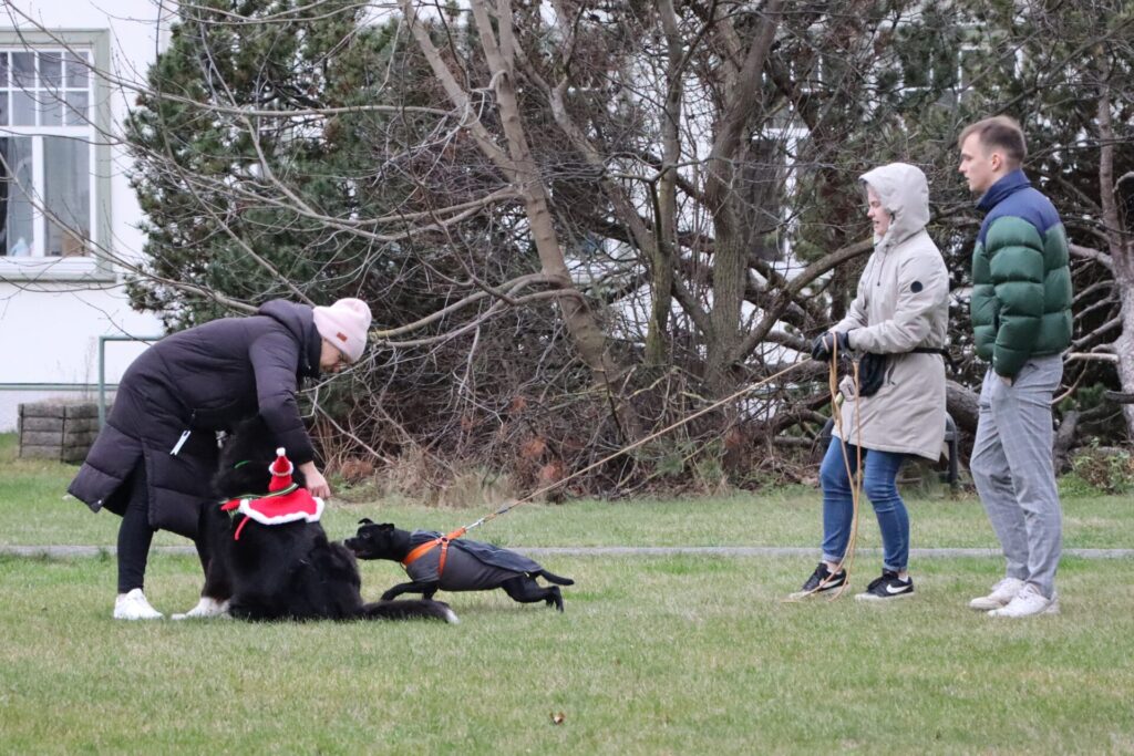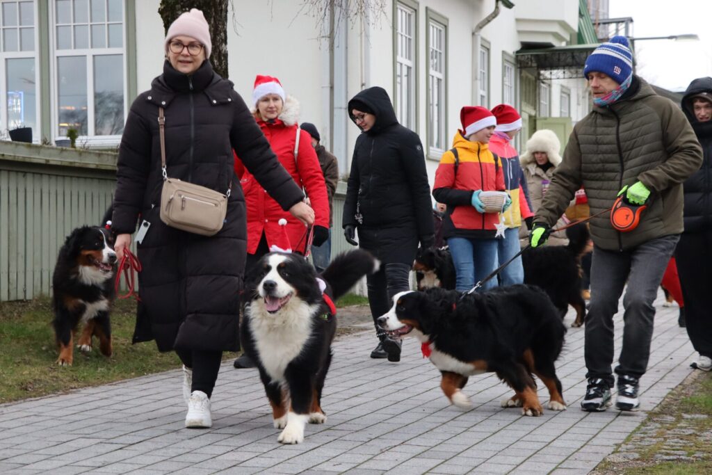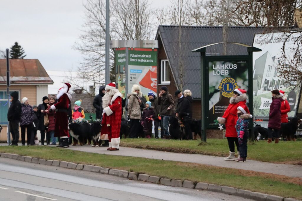Läänemaa berni alpi karjakoerad jalutasid kolmandat korda koos oma pererahvaga Haapsalu kaubamaja juurest Lossiplatsile, et jõuluvana käest oma pakid kätte saada.
